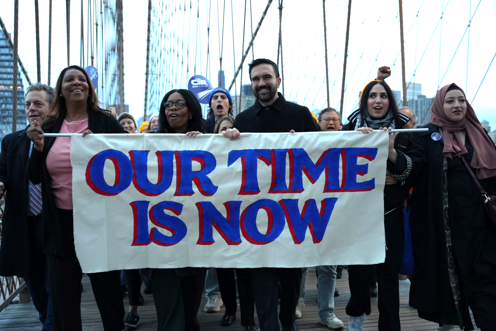 Snart närmar sig en liten grupp vid brons fot. Framför sig bär de en banderoll med texten ”Our time is now.” I fronten går Zohran Mamdani. Allteftersom de passerar de väntande på bron växer den lilla gruppen till en manifestation med hundratals deltagare. De skanderar kampanjens huvudbudskap: “Freeze the rent!” och “Fast and free buses!”